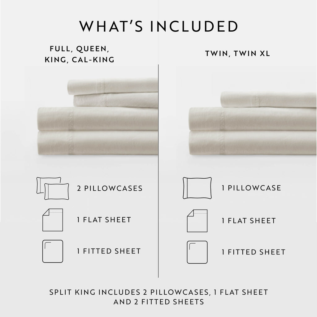 - KING: 1 flat sheet (108" x 102"), 1 fitted sheet (78" x 80" x 14") and 2 King pillowcases (20" x 40")