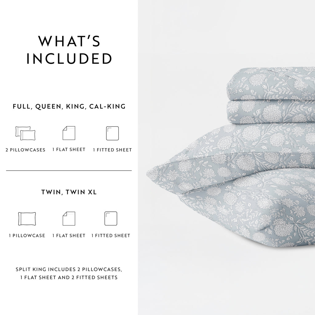 - KING: 1 flat sheet (108" x 102"), 1 fitted sheet (78" x 80" x 14") and 2 King pillowcases (20" x 40")