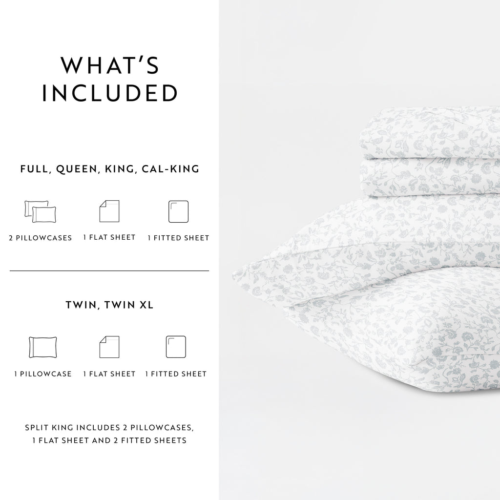 - KING: 1 flat sheet (108" x 102"), 1 fitted sheet (78" x 80" x 14") and 2 King pillowcases (20" x 40")