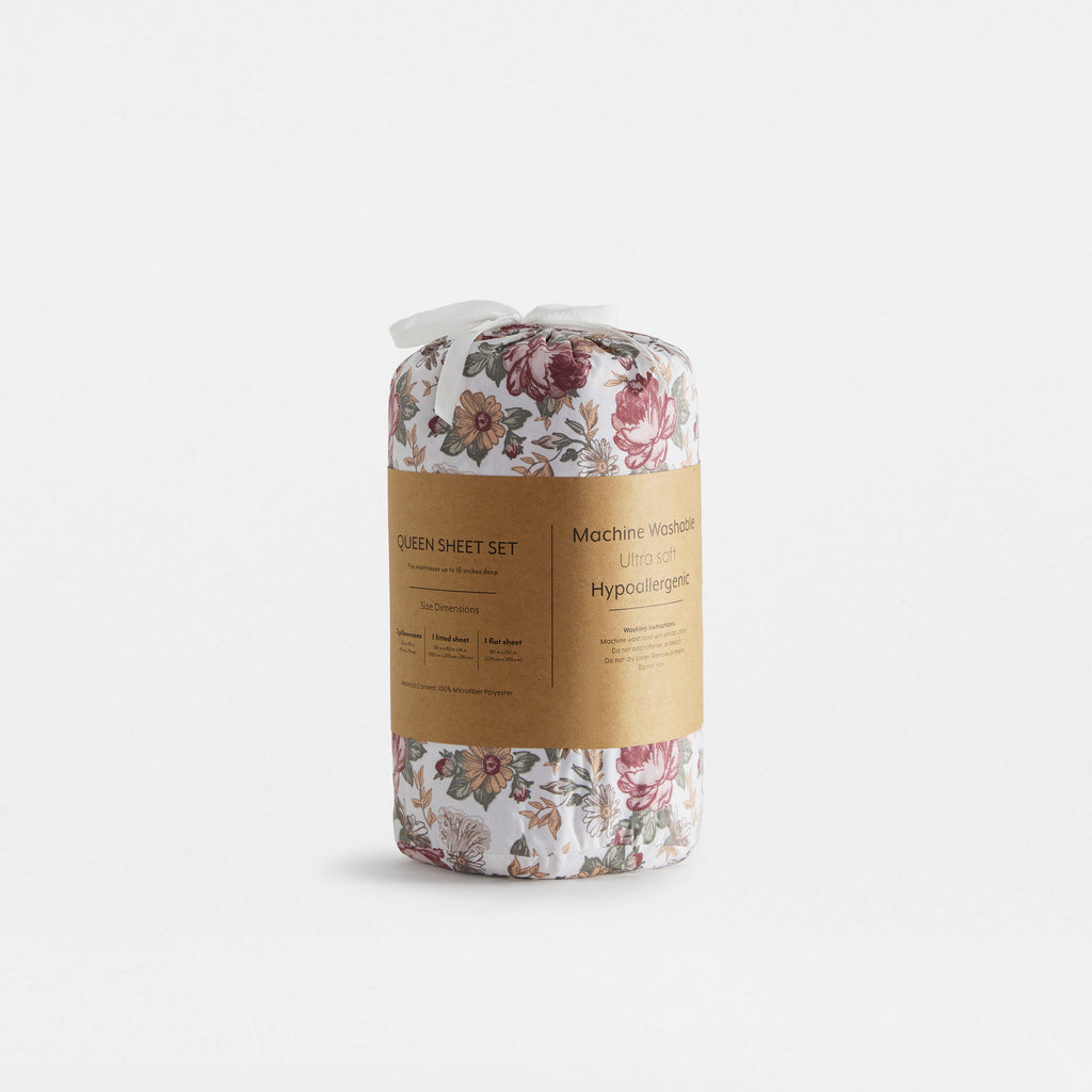 - QUEEN: 1 flat sheet (90" x 102"), 1 fitted sheet (60" x 80" x 14") and 2 pillowcases (20" x 30")