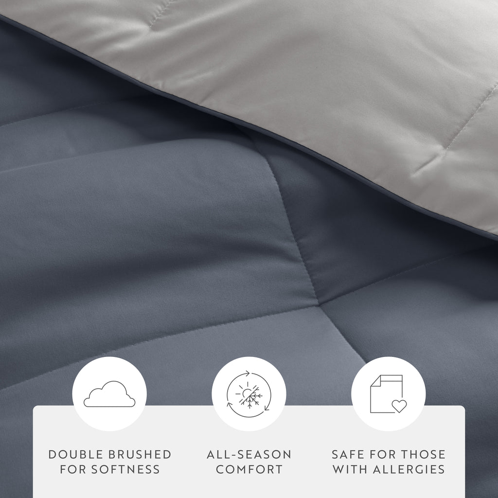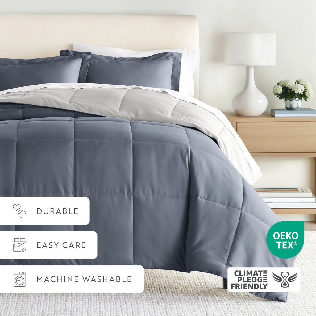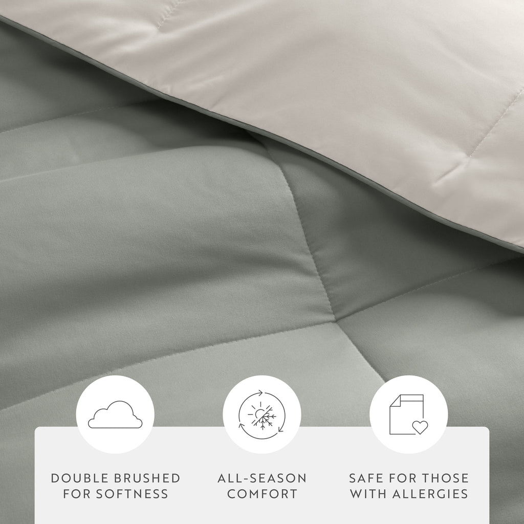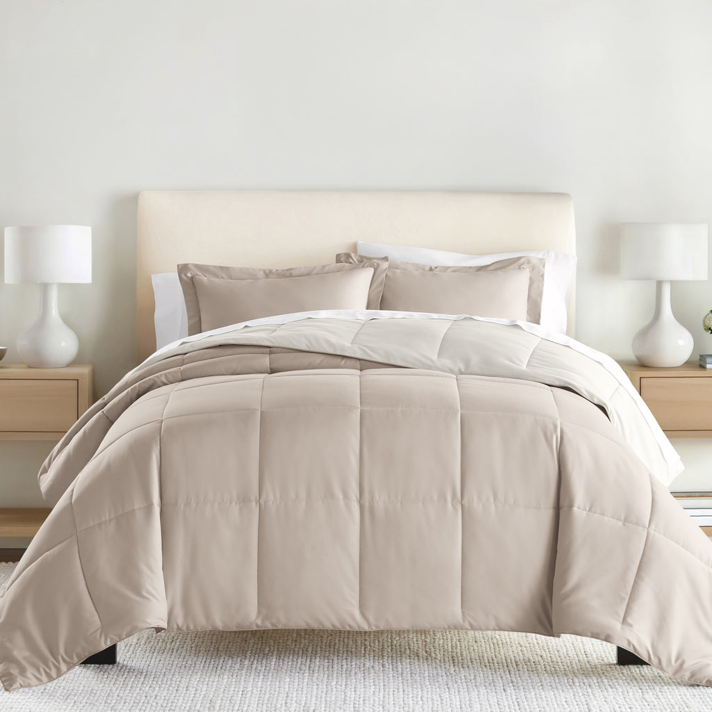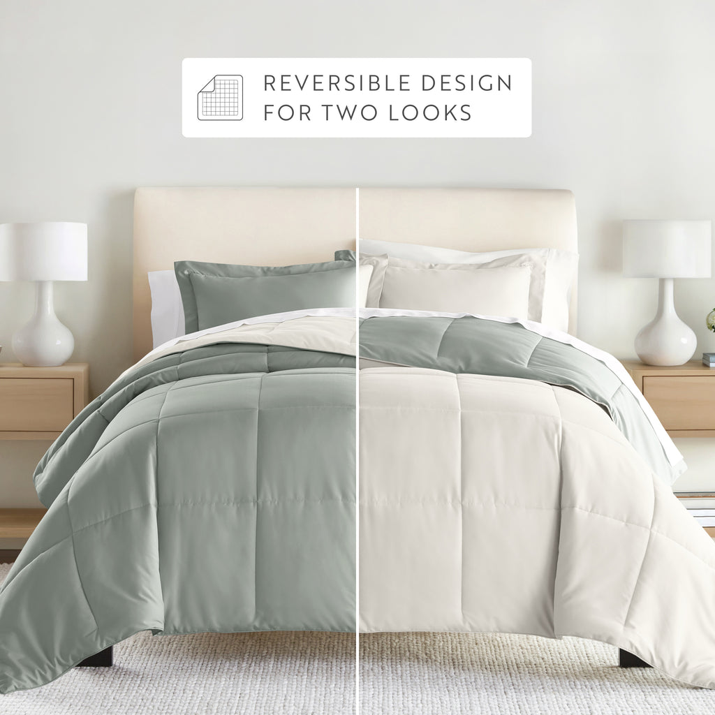 Give your bedding a brand new look and feel with this lightweight, all season reversible comforter set. Presenting a down alternative quality, it's incredible softness makes it the perfect comforter to keep you cozy all year round. The sewn through box stitching prevents the fibers from shifting. Featuring a reversible design of aesthetically matched colors, this set is ideal for making quick style changes to your sleep space!