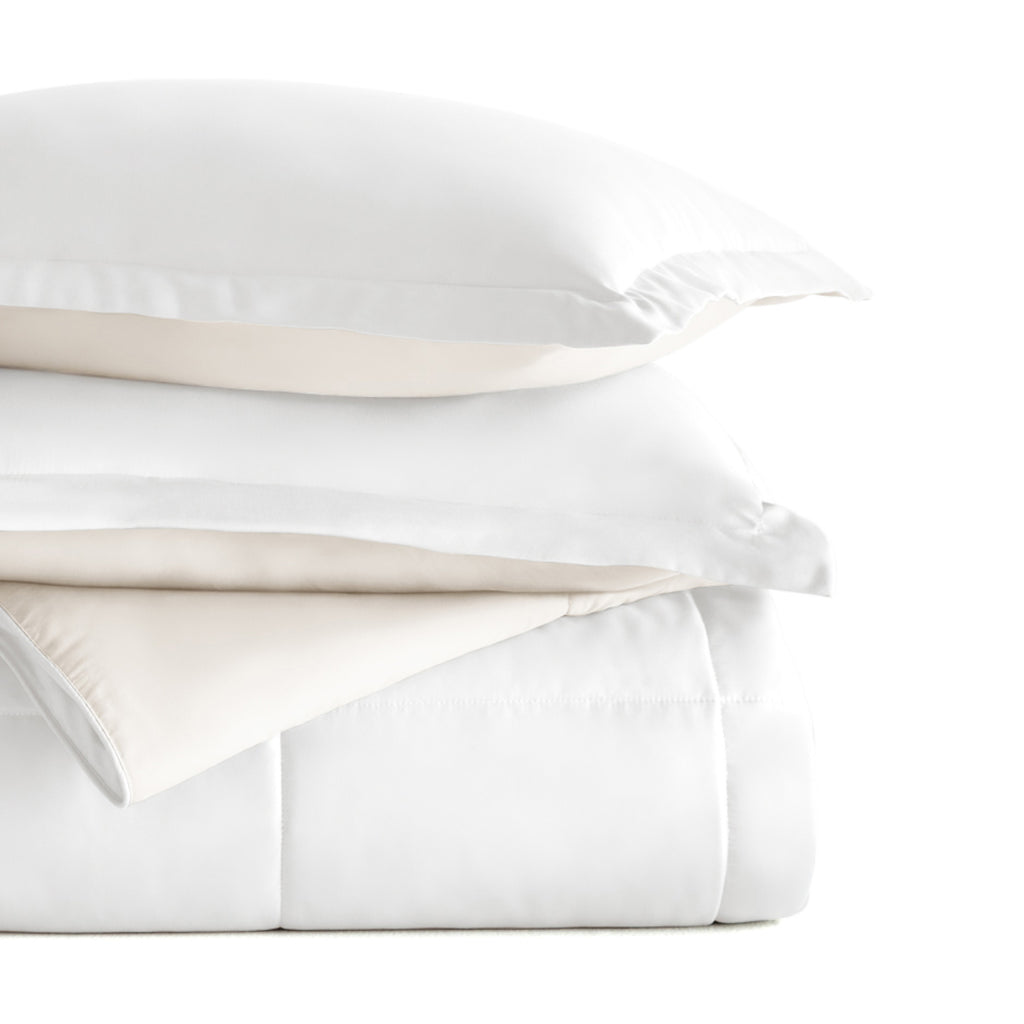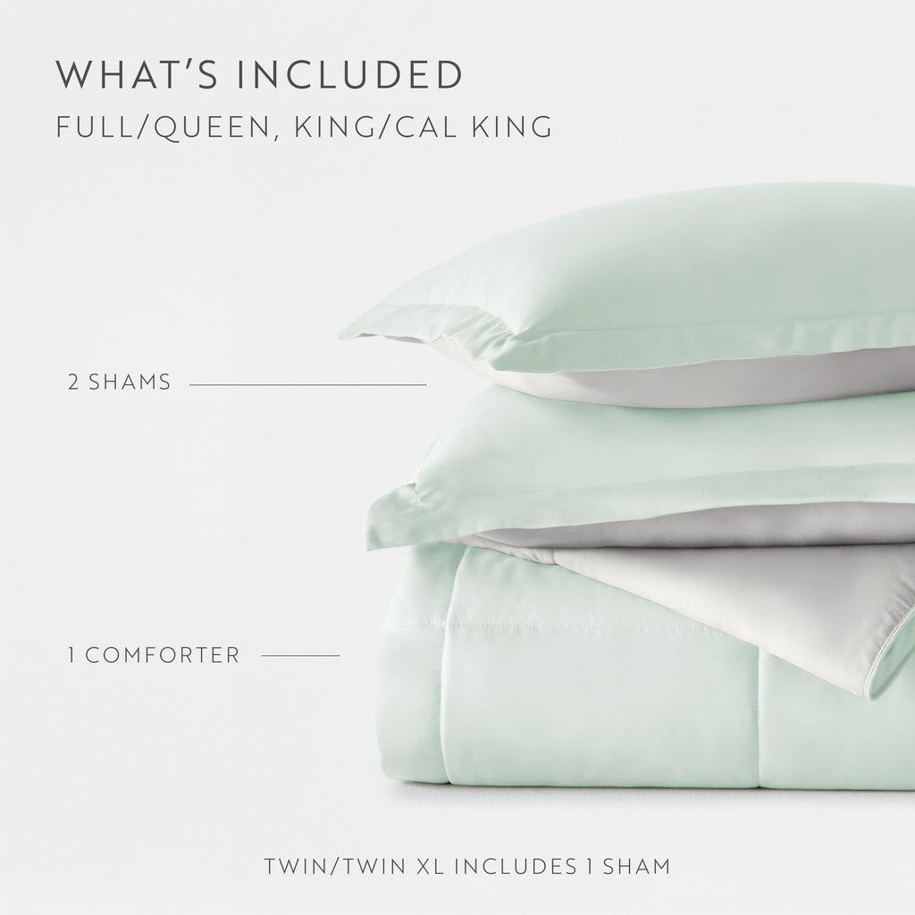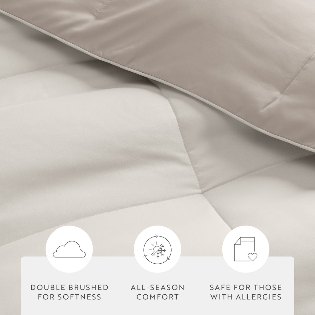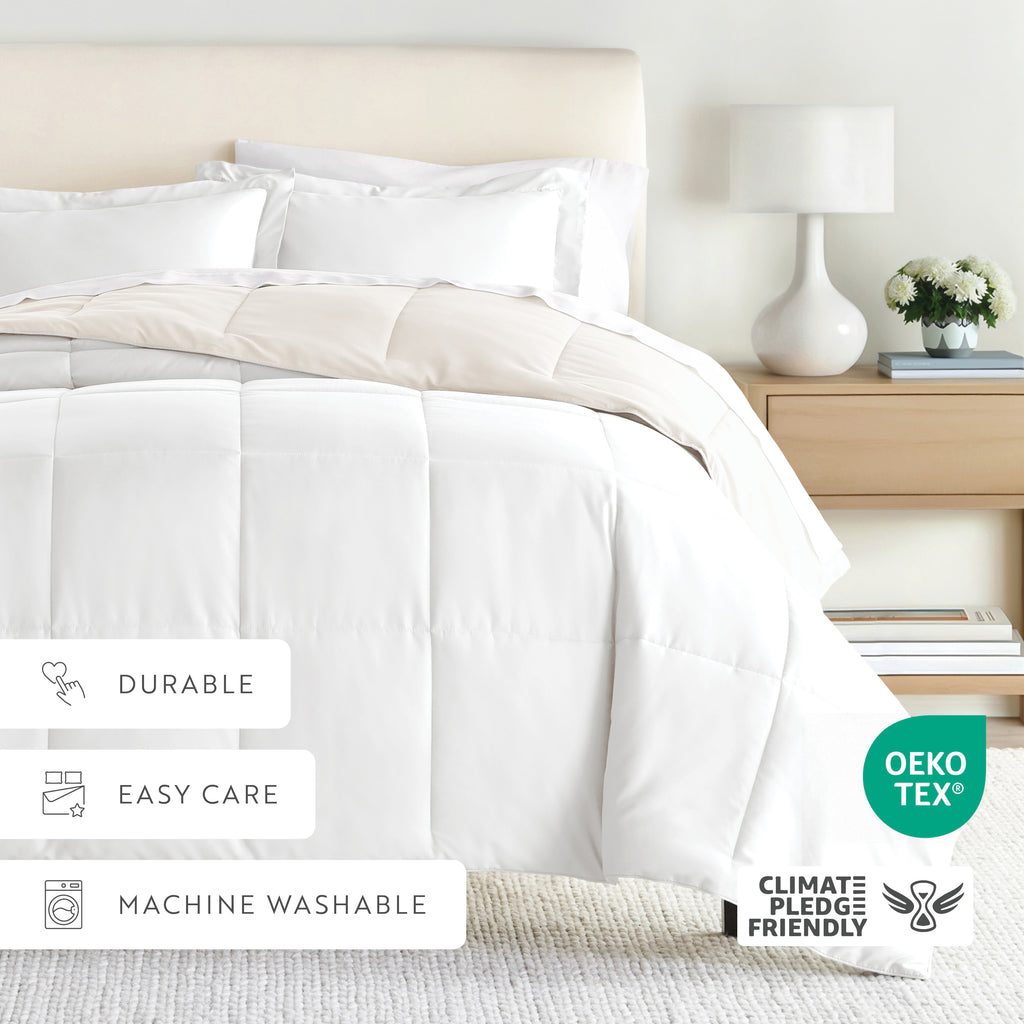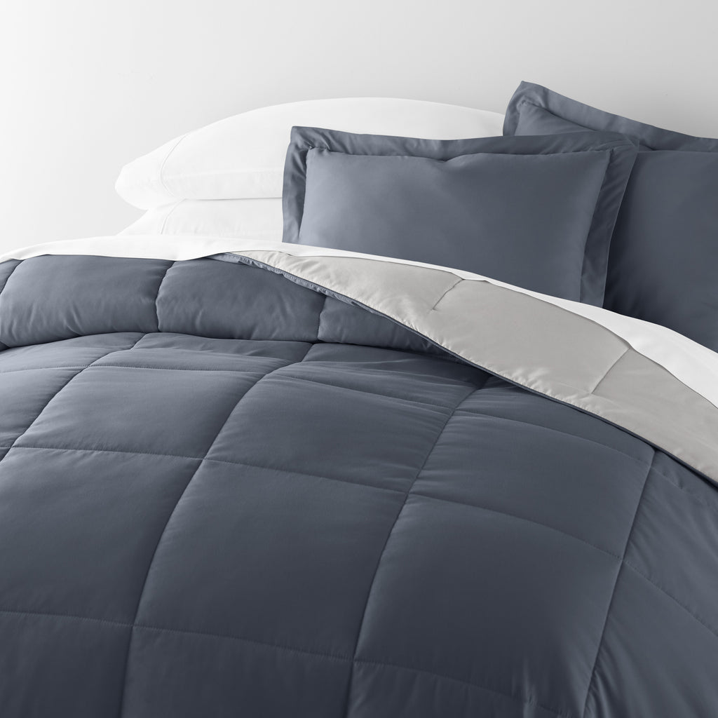 Give your bedding a brand new look and feel with this lightweight, all season reversible comforter set. Presenting a down alternative quality, it's incredible softness makes it the perfect comforter to keep you cozy all year round. The sewn through box stitching prevents the fibers from shifting. Featuring a reversible design of aesthetically matched colors, this set is ideal for making quick style changes to your sleep space!