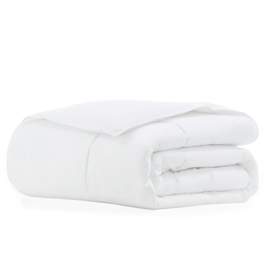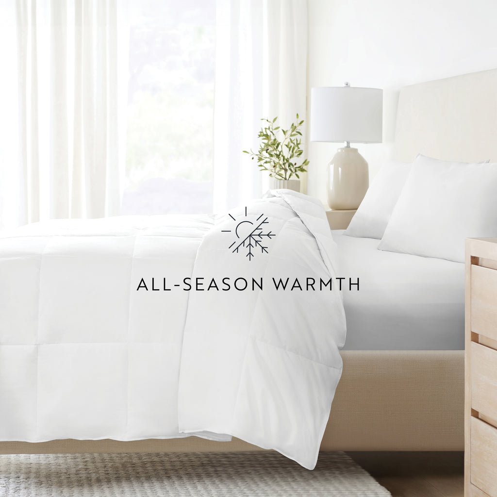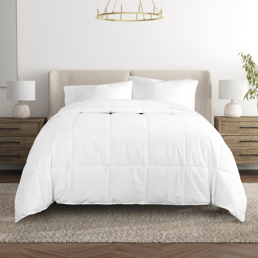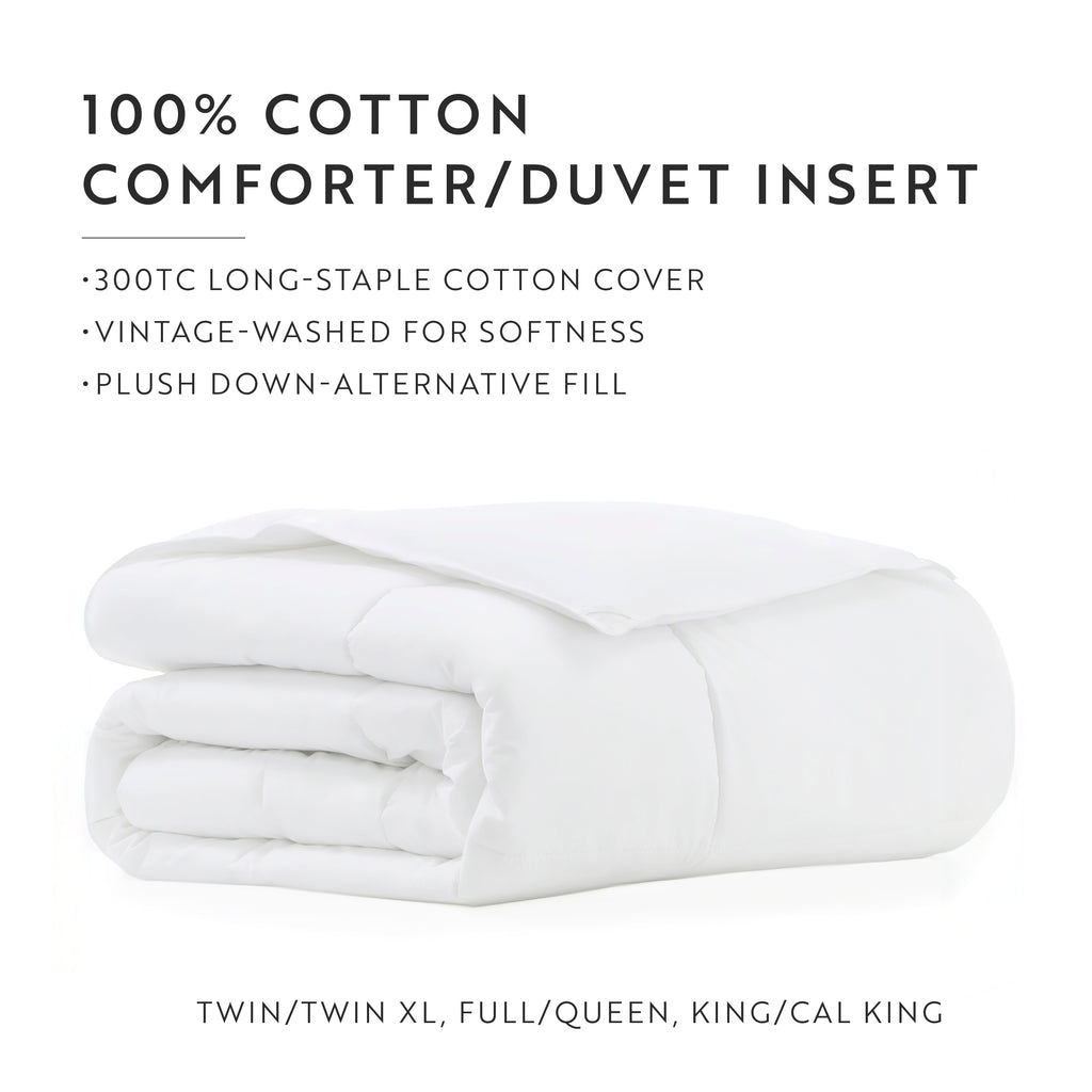 Indulge in the ultimate comfort with our Ultra plush 100% Cotton, Down Alternative Comforter. Crafted with a 300 Thread Count 100% brushed and washed Long Staple Cotton shell and filled with Ultra Plush Hollow Fiber down alternative, this comforter offers a perfect blend of softness and warmth. Designed with convenient loops at the corners, it easily secures to duvet covers, ensuring it stays perfectly in place. Experience a restful night's sleep wrapped in the gentle embrace of high-quality materials designed for lasting coziness and style. Ideal for year-round use, this white comforter elevates your bedding experience.