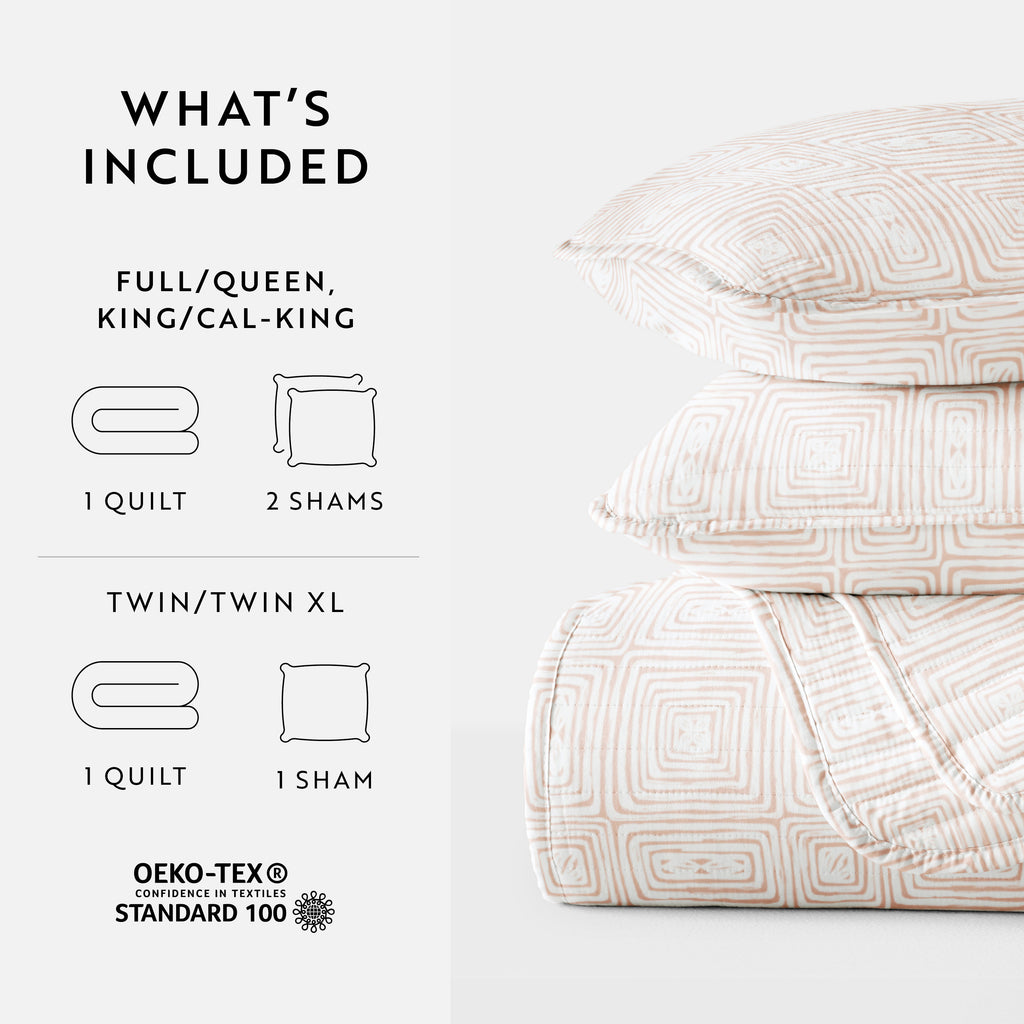 - KING/CAL-KING: 1 quilt (108" x 96") and 2 King pillow shams (20" x 36")