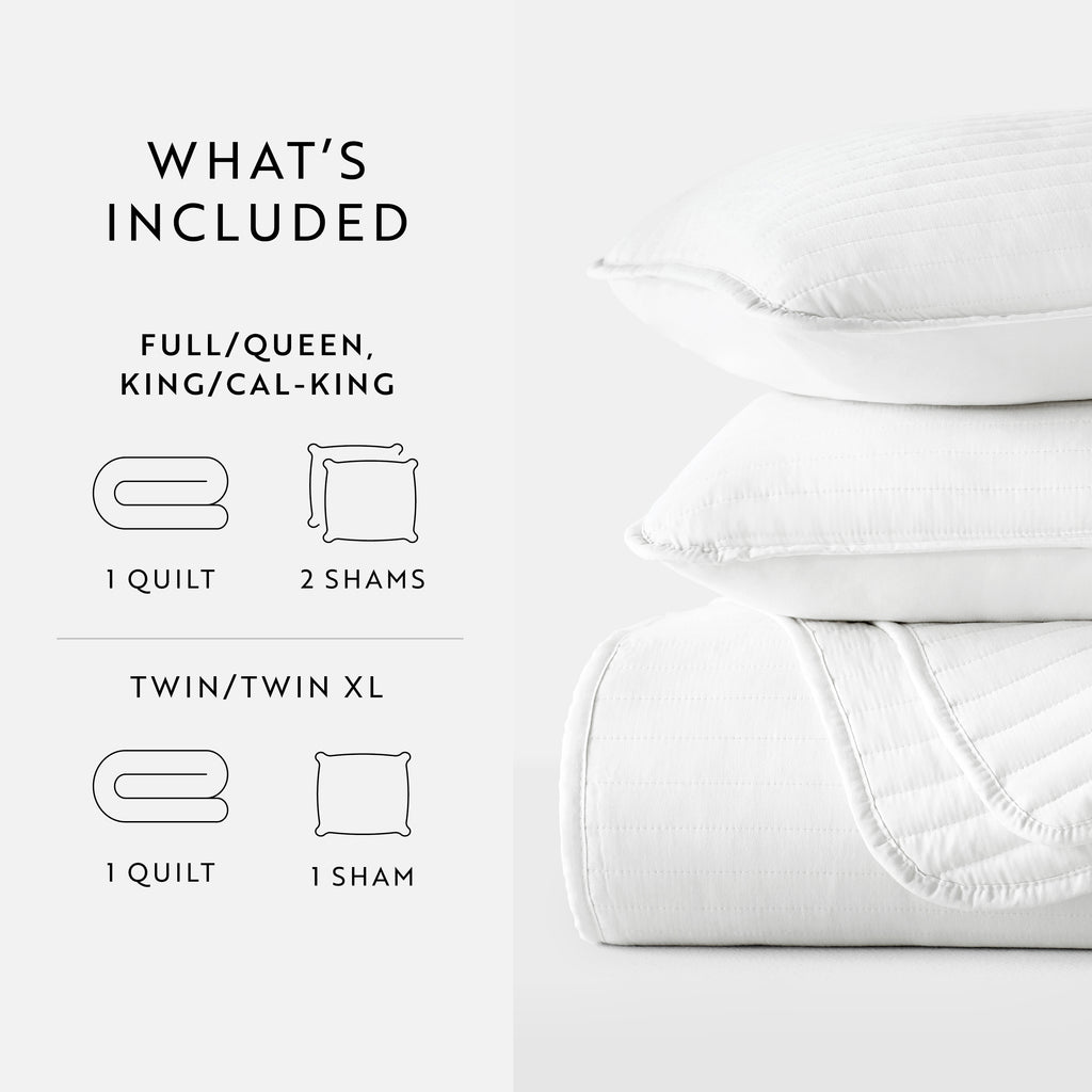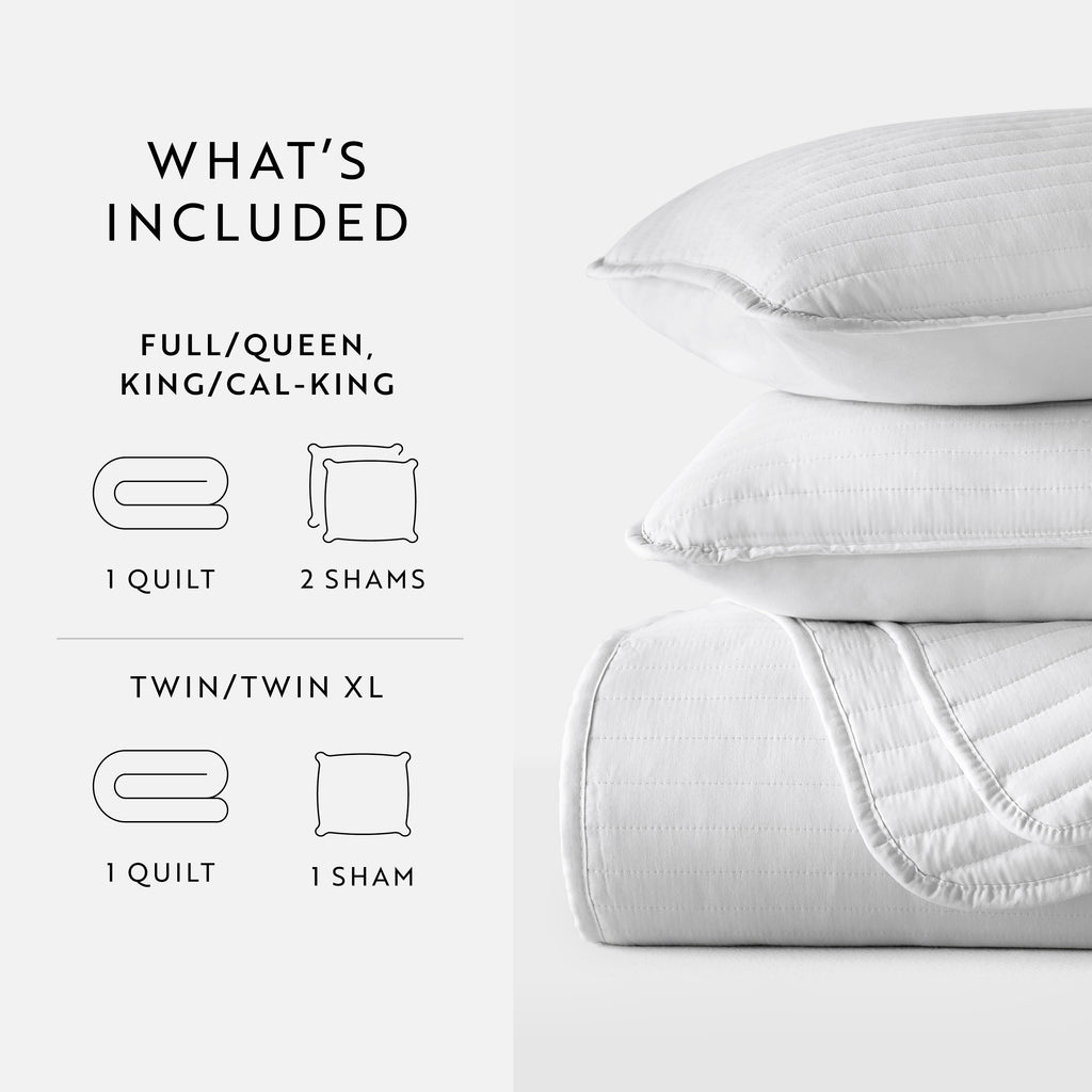 - KING/CAL-KING: 1 quilt (108" x 96") and 2 King pillow shams (20" x 36")