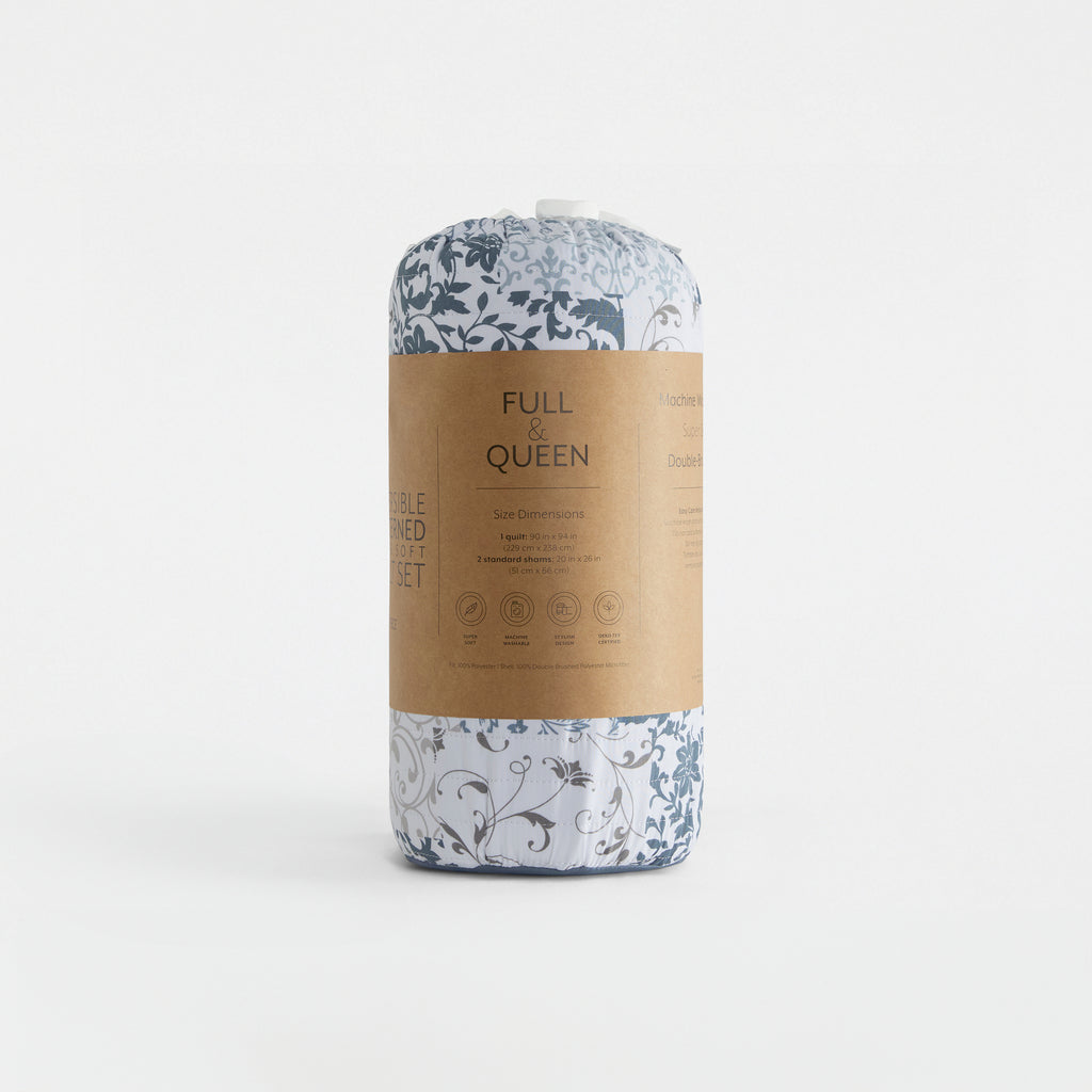 - FULL/QUEEN: 1 quilt (90" x 94") and 2 pillow shams (20" x 26")
